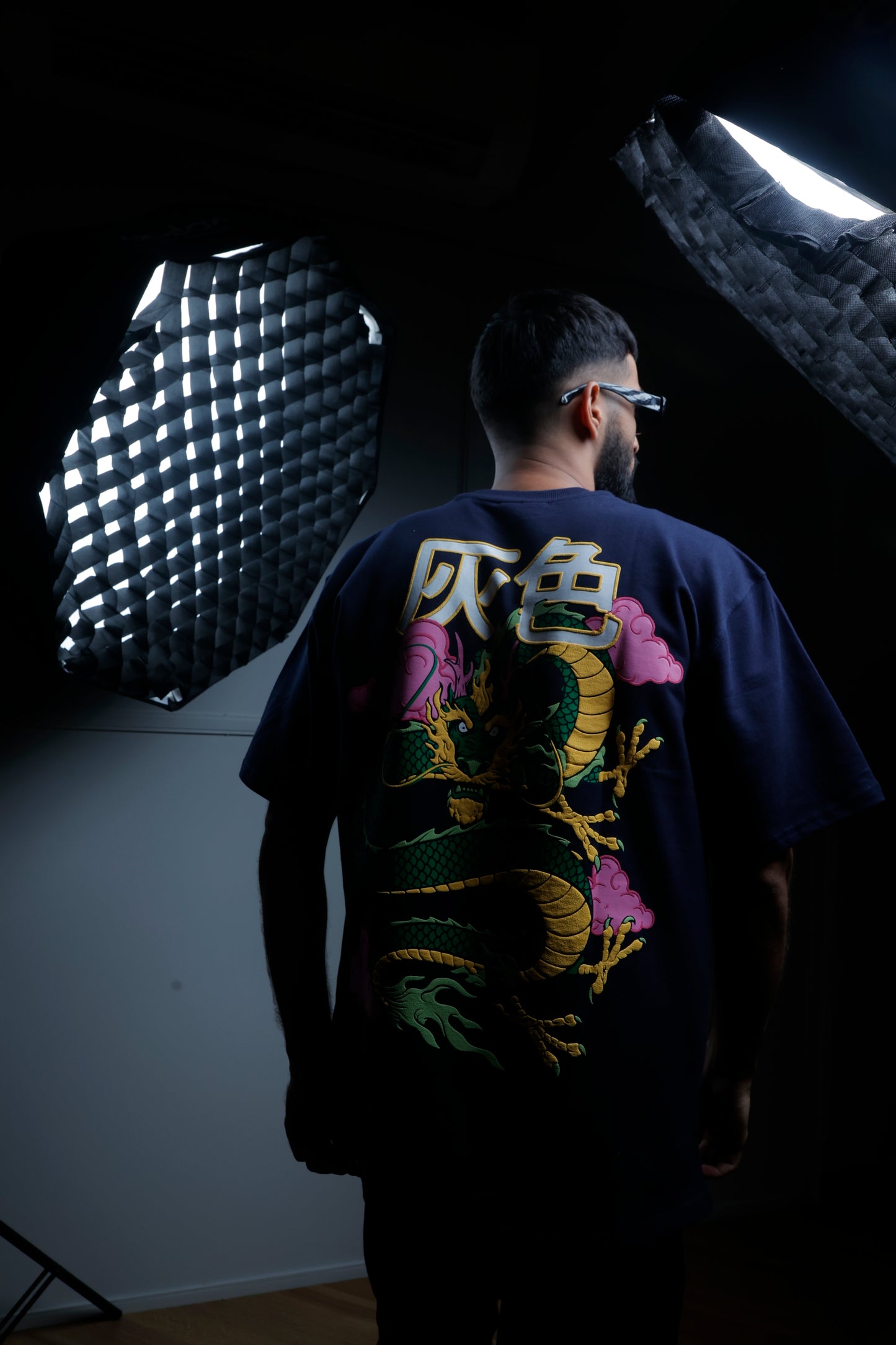 Dragon in Navy— myth, motion, and modern mystique. This navy tee roars to life with a serpentine dragon twisting through pink storm clouds, crowned by bold kanji for an East-meets-street statement that hits hard and haunts longer.